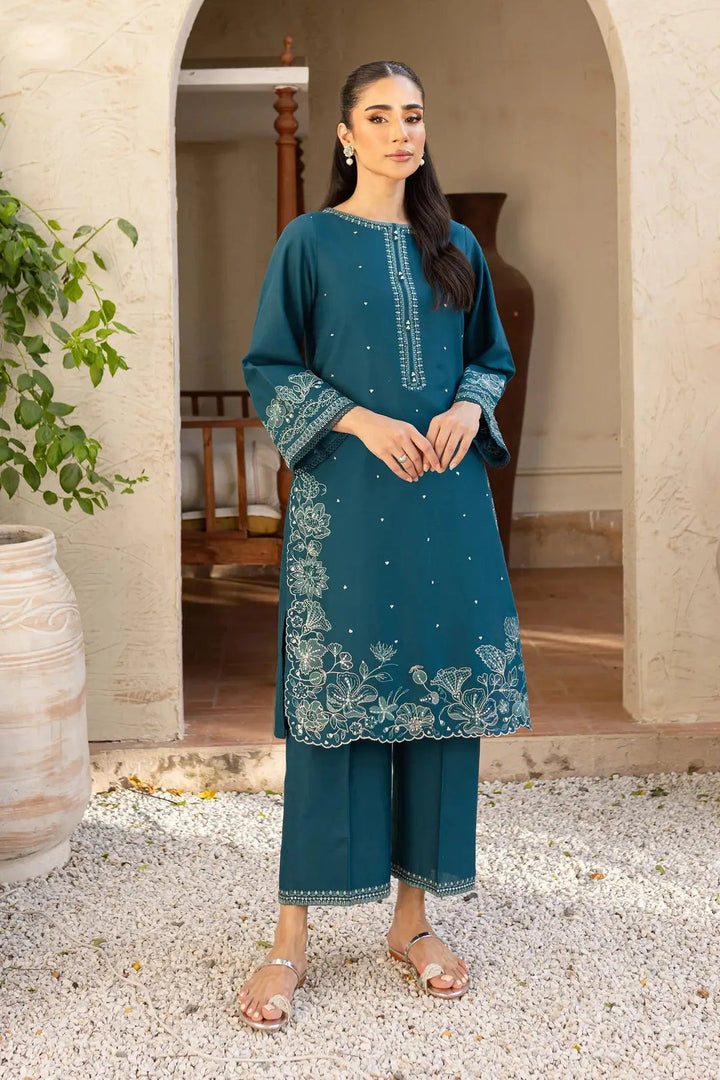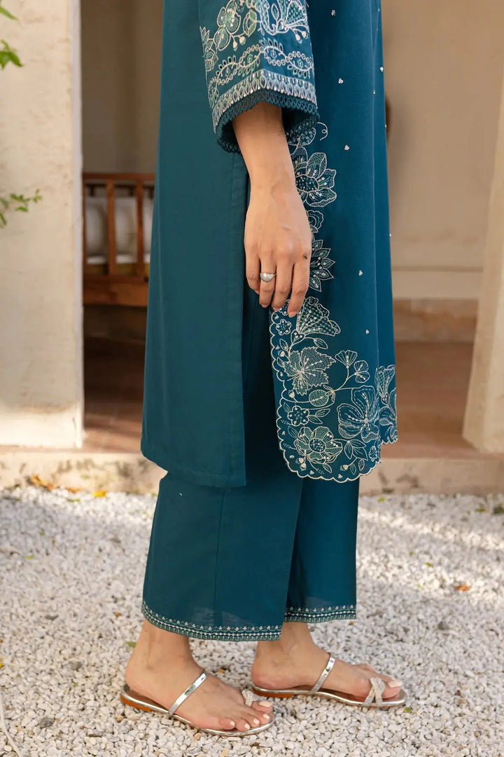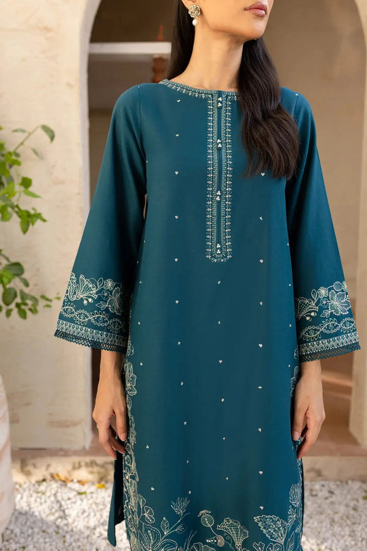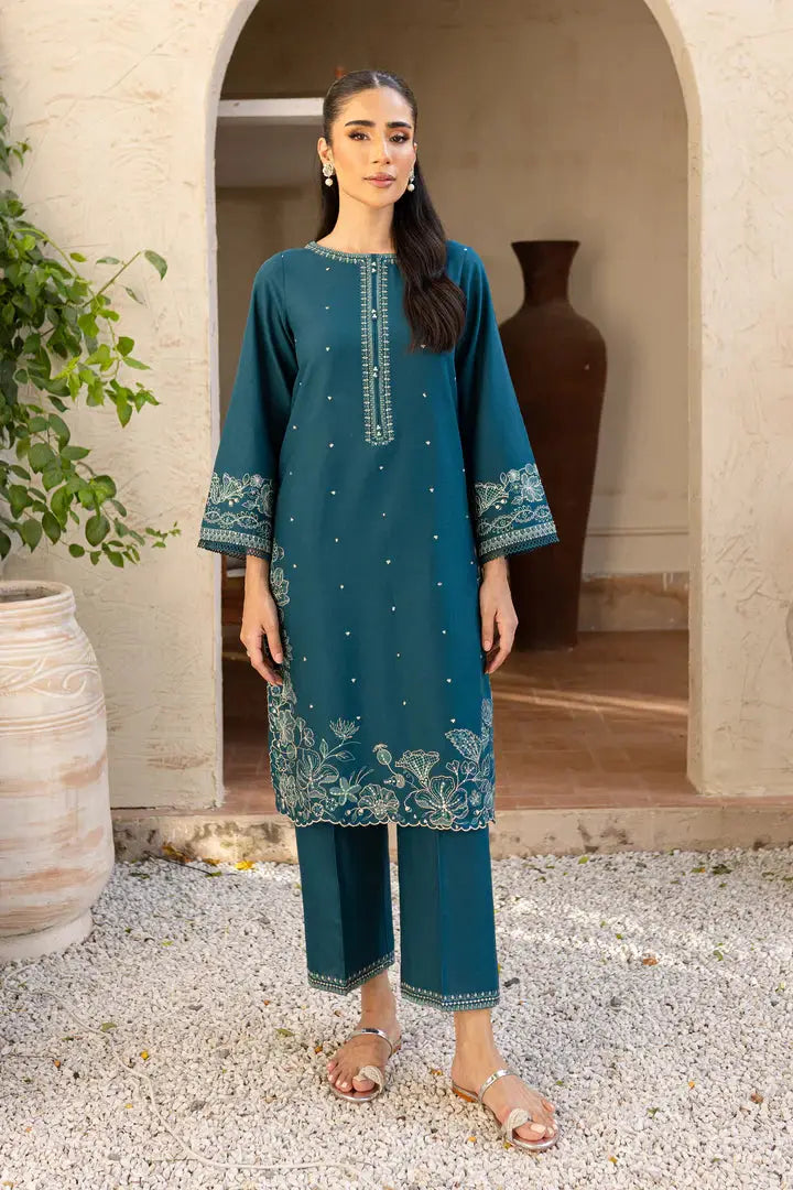 π Embroidered Shirt: A rich teal khaddar shirt exquisitely adorned with intricate floral embroidery on the front, hemline, and sleeves β complemented by delicate mirror-style detailing for a graceful, elegant look.