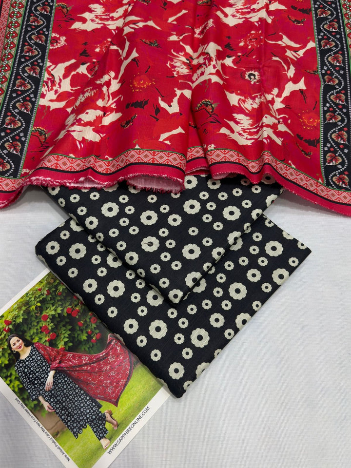 π§£ Striking Printed Dupatta: Paired with a bold red khaddar dupatta adorned with intricate floral prints β a vibrant contrast that adds elegance and charm to the overall look.